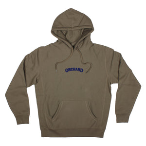 Extra heavyweight premium 450gm cross weave pullover hooded sweatshirt in olive green with twilight blue embroidered text logo.