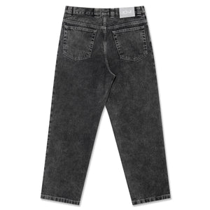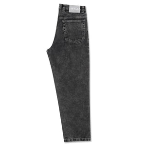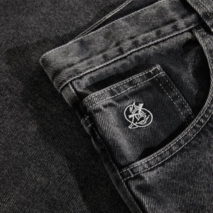 Semi-baggy denim trousers with straight legs and a relaxed fit. Made from 100% cotton denim in a washed Silver Black tone, with a heavyweight 435 gsm structure. Features embroidery on the change pocket, a woven label on the waist, a YKK zipper, and a custom YKK button.